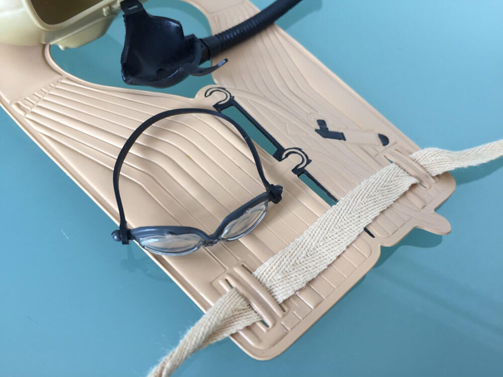 The Action Man Luftwaffe Pilot uniform has glued on silk printed insignia that often is missing. It is a very light material and the pocket flaps just sewn details. His boots are the same pattern as the Battle of Britain Pilot. The oxygen mask stretches between two holes in the flying helmet. A red scarf is often missing - it is a nylon material and tends to reform into a tube shape instead of laying flat. The life preserver has printed details and along with the goggles, belt and flying helmet, are unique to this set. The 'current Action Man figure at the time of launch in 1979 was an Eagle Eye dynamic body.