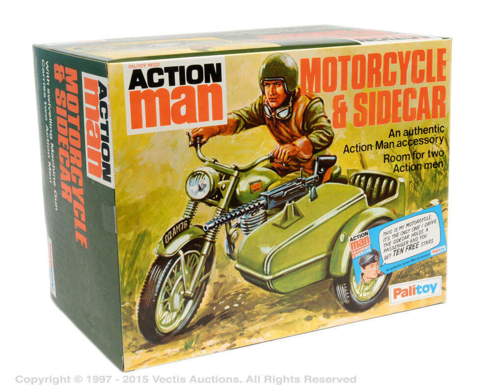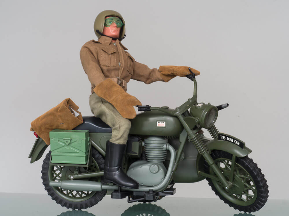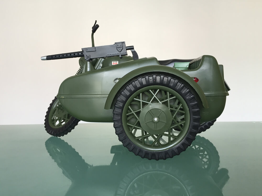 "An authentic new Action Man accessory with seating for two Action Men and swiveling machine gun". The Action Man Motorcycle Combination first appears in the 1976 Equipment Manual. "Authentic" is perhaps in response to losing sales to rival firm of the time 'Cherilea', who also made so wonderful vehicles to suit Action Man. Also 1976, the Action Man Despatch Rider was created for the new motorcycle and sidecar. A German Motorcycle and Sidecar (Afrika Korps / DAK) version was produced in a desert sand colour from the same molds in 1978.