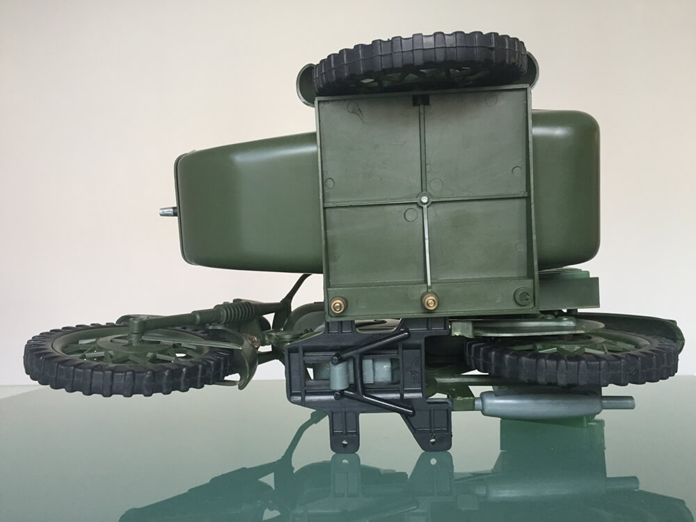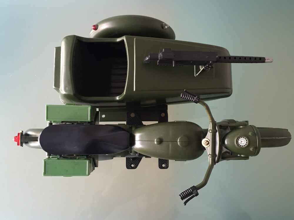 The Action Man Motorcycle 'Combination' as it was called in the 1977 Equipment Manual, was actually boxed as the 'Motorcycle and Sidecar'. Made of a harder plastic than the tough blow-molded transport, this product was a little brittle and prone to damage when used in play adventure. The sidecar can be affixed / removed by undoing two screws on the baseplate. This baseplate is fragile and usually shows lighter stress marks. The brake levers are also very vulnerable to damage. In the same year a Despatch Rider was created for this vehicle. The German (Africa Corps) version of this Action Man Motorcycle and Sidecar is the rarer of the two and included the DAK uniform in the box.