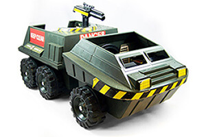The Action Man Multi Terrain Vehicle was introduction in 1978. Of a design first conceived by Hasbro in the US, it featured an articulated mid section, (bellows hitch) and room for Action Men fore and aft. The vehicle came with a sticker sheet and instructions, however card decals in the rear inner section were pre-applied. The was a non-functioning gun and a yoke section. The Action Man 1978 Equipment Manual page reads "To transport stores, equipment or Team Members over the roughest country, the Multi Terrain Vehicle provides the answer. Articulated cab and six large wheels."