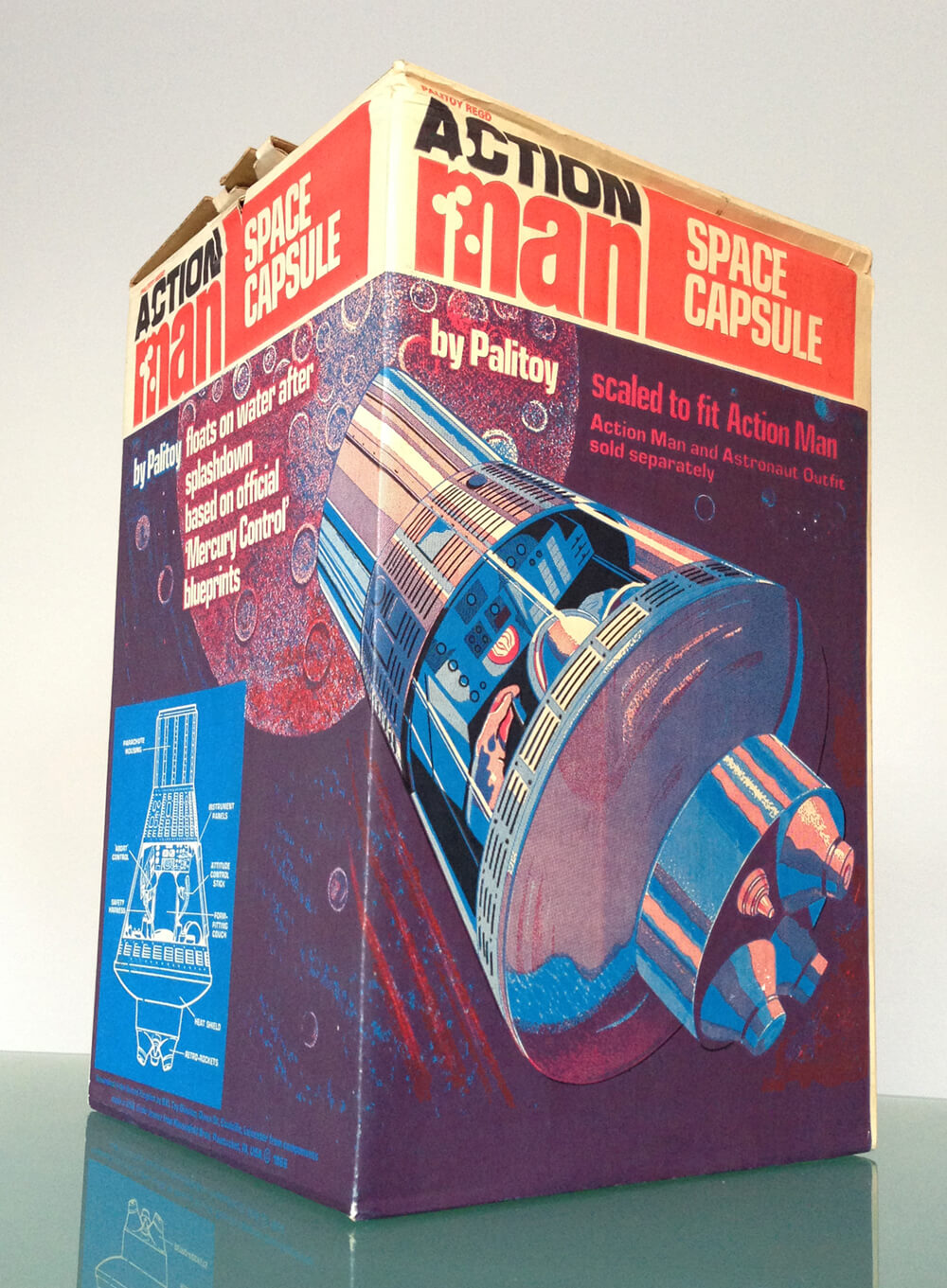 "Every Astronaut needs a capsule before he can blast off into outer-space. Action Man Astronaut has his! Designed from the Mercury space craft blueprints and scaled to fit him perfectly, it will float in the water after splashdown!".