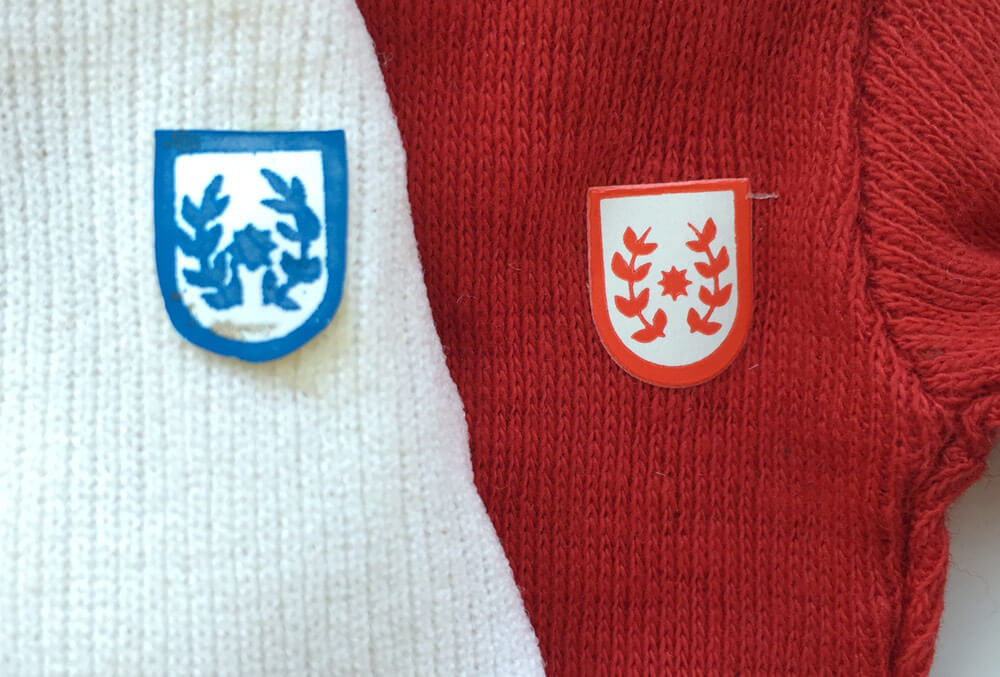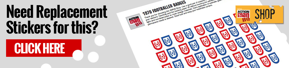 Action Man Action Footballer Badge 1st issue c.1968 (left) and later issue c. 1969 (right). Buy replacement stickers here