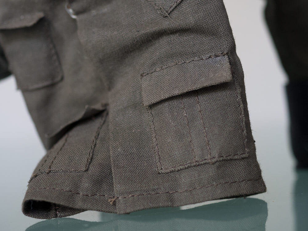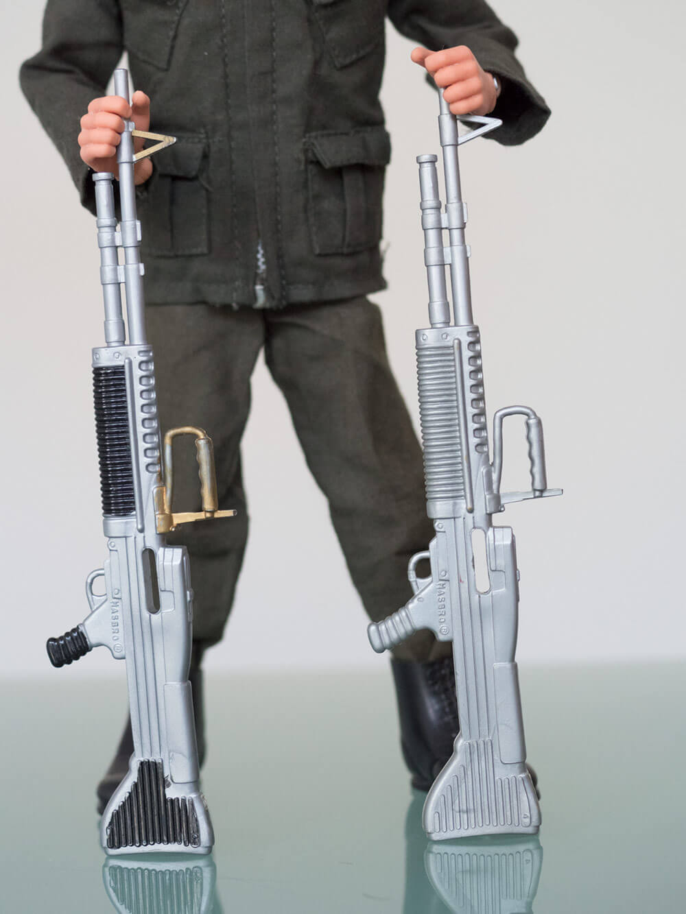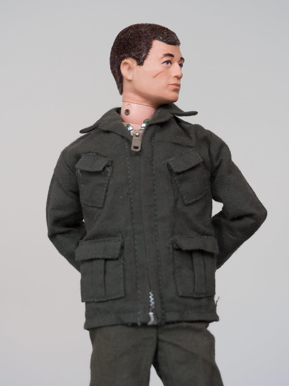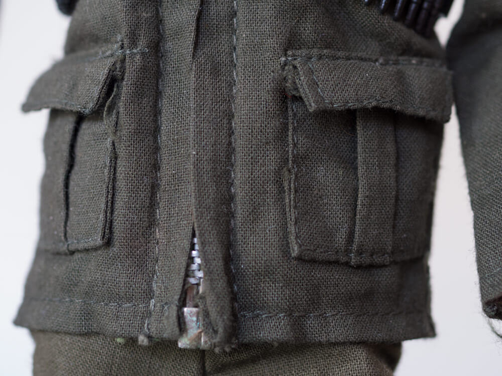 The Action Man Commando jacket changed from hidden zippered to poppers and got even lighter in fabric towards the end of production. The original pockets' flaps were originally stitched, but ended up unhemmed with no stitching. Pleating from the lower pockets also disappeared at the same time. The M60 machine gun is not uncommon, but its bi-pod is easily broken at the hinges. This M60 machine gun also evolved by end of production to one with no gold and black paint detailing (see images). The current figure in 1975 was a flock haired gripping hands Action Man. The figure in these set of Commando images has reproduction hands.