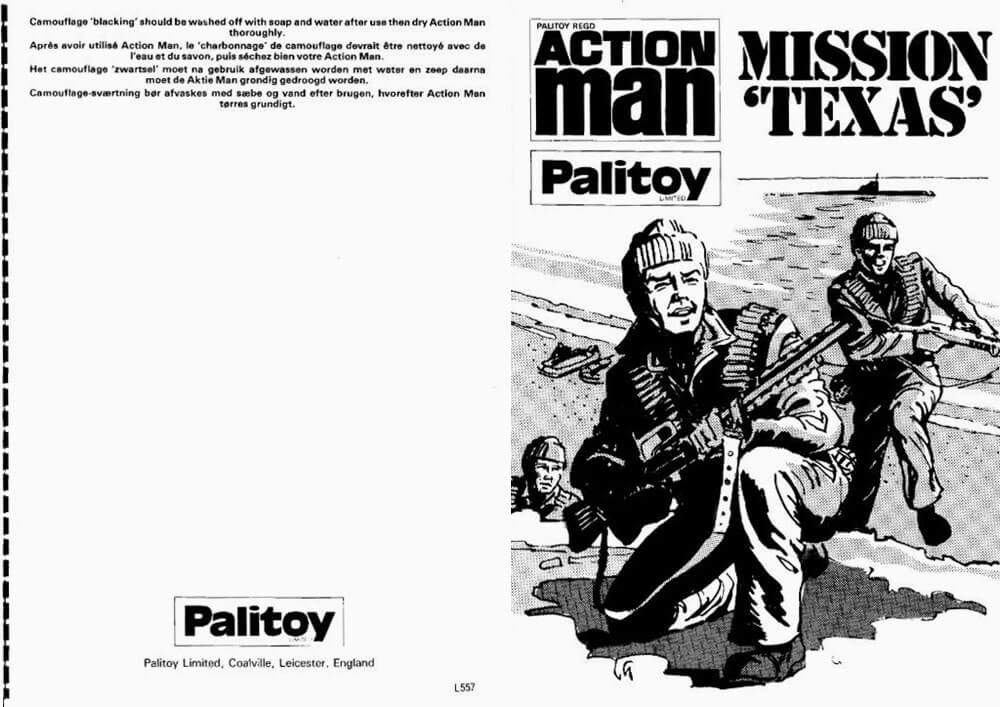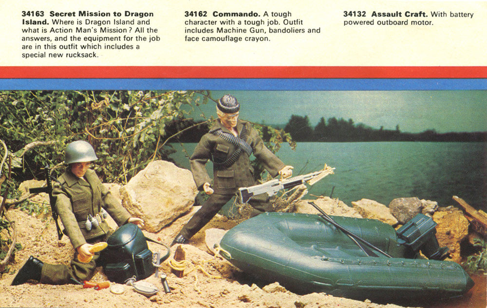 "A tough character with a tough job". The Action Man Commando was the ideal figure for the Action Man Assault Craft. Kitted out with the hefty M60 machine gun and bandoliers, he originally came with a brown face camo crayon (replacements here) so that he could 'black' his face ready for Mission 'Texas' as his leaflet describes. His uniform was a rather simple affair. His lightweight jacket had tell-tale diagonal top pockets throughout production, however zips became poppers and materials changed as a cost cutting by Palitoy. The black 'bandolier' ammo belts are borrowed from the Australian Jungle Fighter of the Soldiers of the World range.