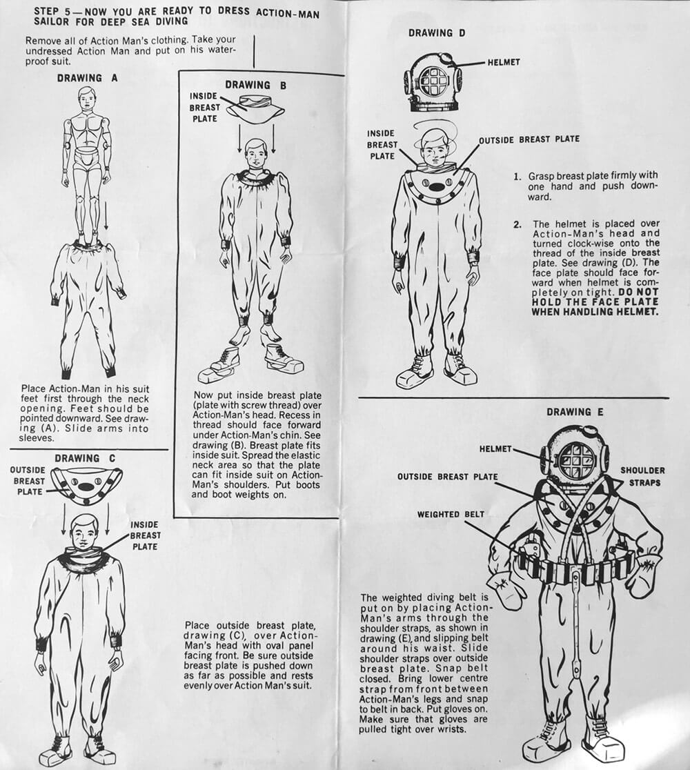 ACTION MAN DEEP SEA DIVER: Fabric diving suit, boots, gloves, boot weights, belt with 2 weights, oxygen pump (built in compass), air hoses, sledge hammer, marker buoy with flag, knife, scabbard, rope, instruction leaflet, Equipment Manual.