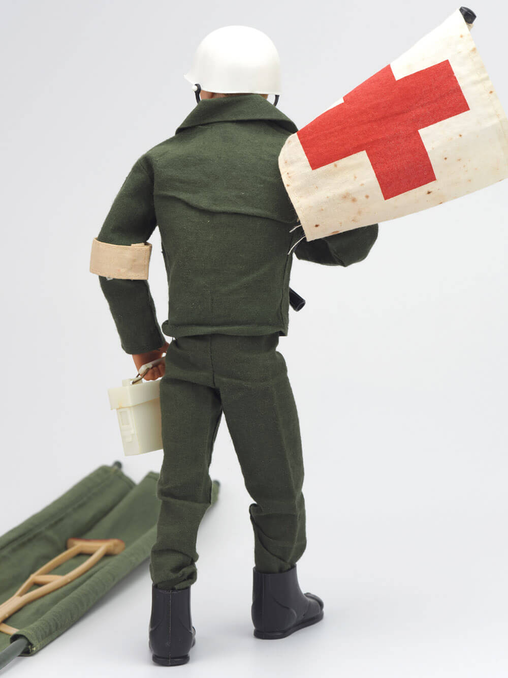 The Medic outfit featured a lighter weight two piece uniform with the red cross emblem on the armband, flag, medical box and helmet. The plasma bottle drip, triangular bandage, long splints, safety pin and some other items from the 1960s iteration of this Medic uniform were dropped, however it redeemed itself by including a shirt, trousers, boots and medical box for the first time.
