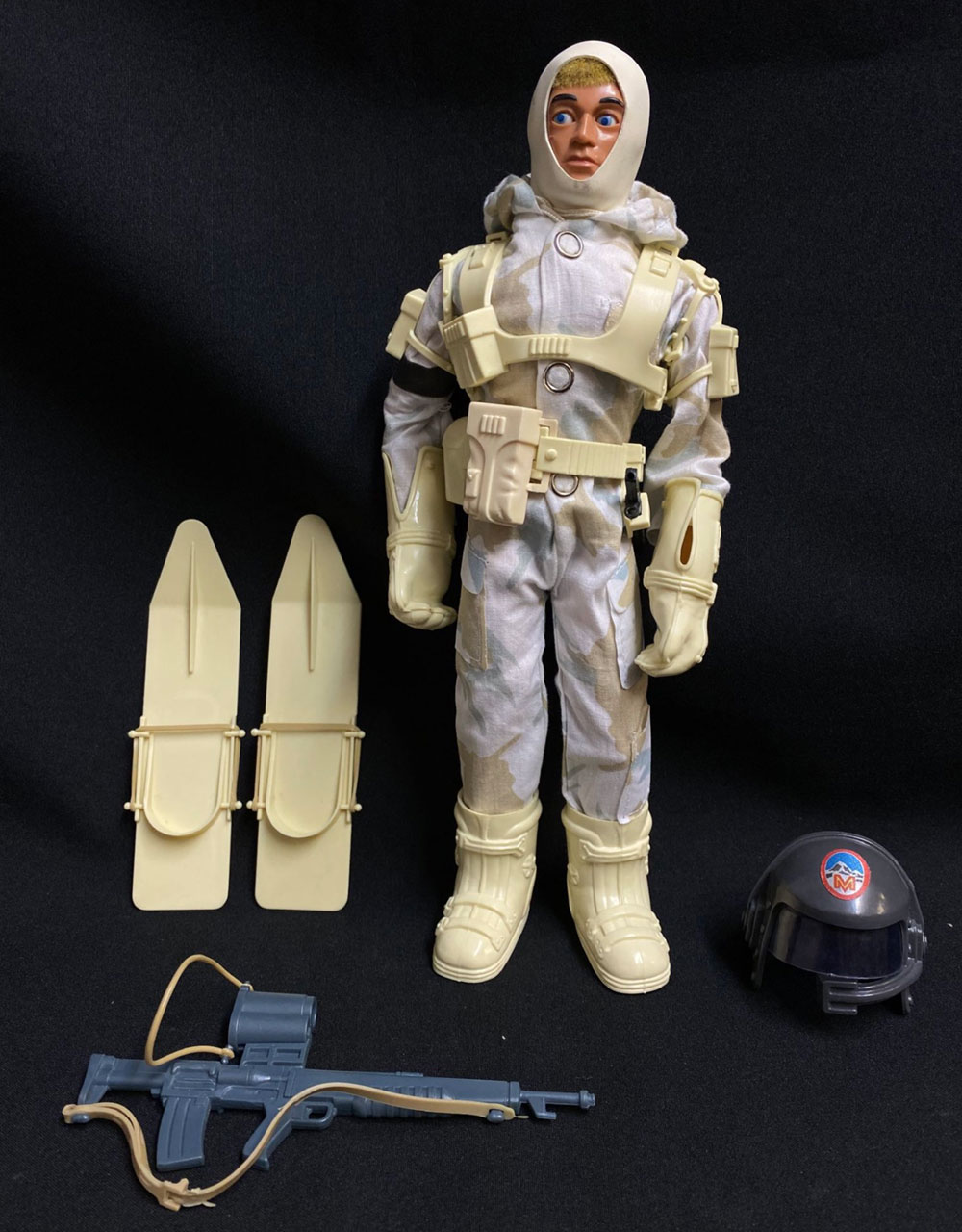These outfits were produced when Action Man sales were on the wain, and the number sold were lower than the majority of Action Man outfits, which make them amongst the rarer of uniforms to find complete especially the Missile Assault. The other three uniforms were shown on reverse of the packs, without the Missile Assault figure show so didn't look planned at that stage. Material divisional badges tend to fall off of helmet and sleeve (replacements available here) and balaclavas perish. The oversized boots rattle a little on the figures (strangely based upon those oversized type previously borrowed from the Six Million Dollar man toy line) and the cumbersome plastic gloves totally negated the development of gripping hands, making weapon holding impossible. The Missile Assault is the rarest of the three, and the Underwater Assault frogman rubber outfit is super rare due to perishing material.