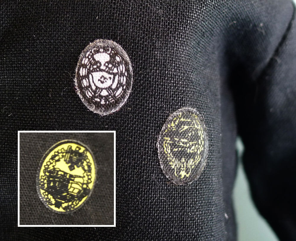 The Action Man German Panzer Captain uniform has lightly glued on fine fabric printed insignia that are often missing (buy replacements here). The Wehrmacht Tank Battle Badge (gold) and Wound badge (silver) ovals are often found upside down from new, but if applying replacement ones it would be a good opportunity to correct this. The shoulder boards are either sewn into the sleeve on some versions or stuck on after manufacture atop the actual material narrow shoulder board hiding underneath. The uniform itself is a very light material and the trousers have a pocket either side. The open countryside paper map was included, but not the cylindrical map tube as with the German Staff Officer before. The Panzer Captain's boots are the short variety - not the German jackboots. The cap is same molding to the German Staff Officer only using a grey plastic and grey and silver paintwork. A grey scarf was included to be worn under the tunic. The goggles should have a plastic strap, as should the binoculars. The 'current Action Man figure at the time of launch in 1981 was an Eagle Eye dynamic body, not a 'fixed eye' or 'hard hands' figure as shown in the images.
